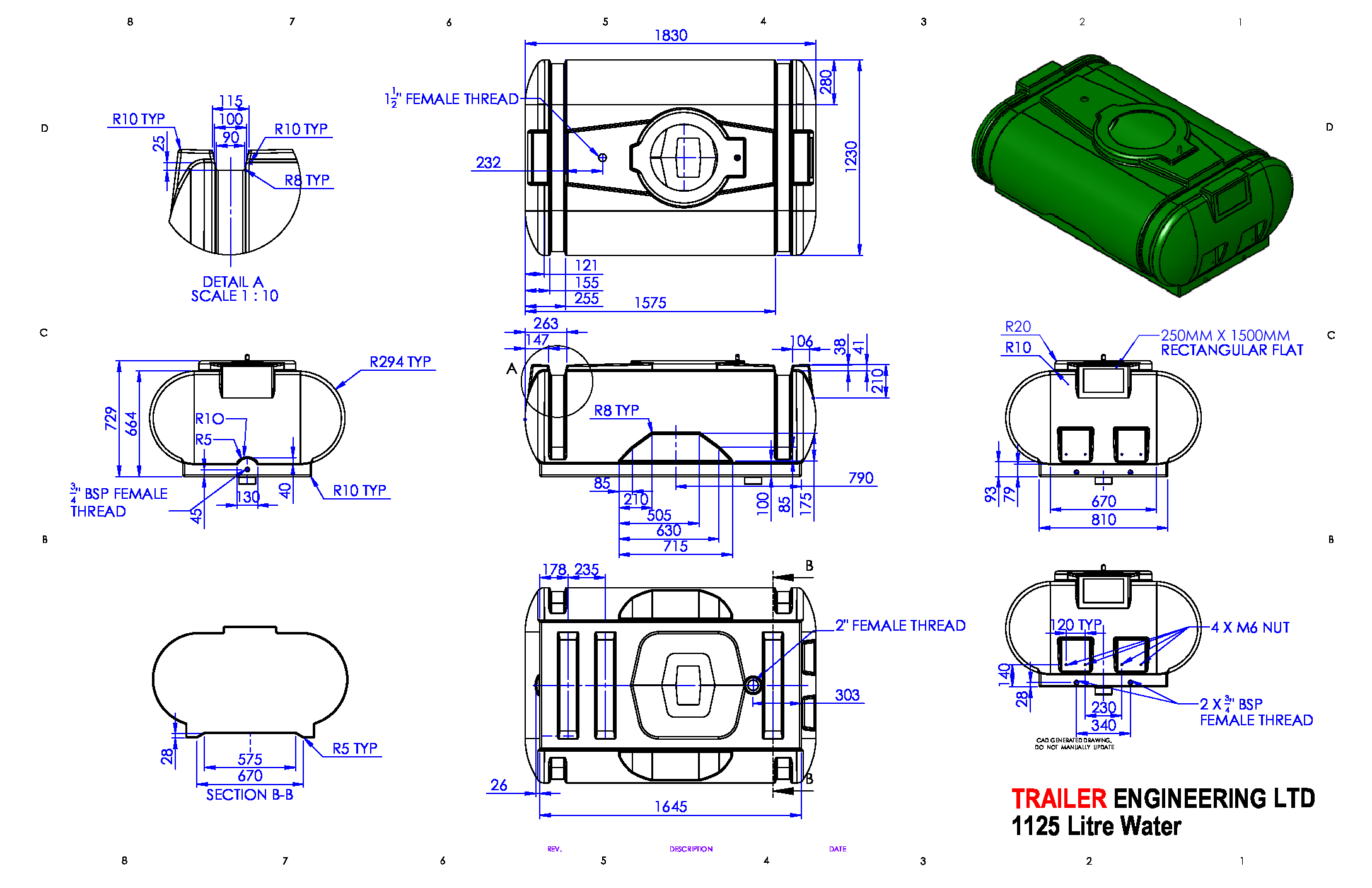 Replacement 1125 litre (250 Gallon) water tank for Trailer Engineering’s water bowser range.