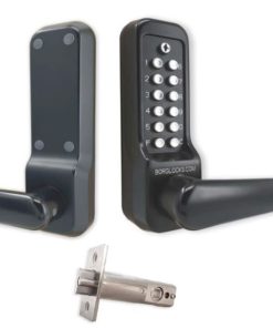 Borg heavy duty marine quality mechanical digital lock. Lever handle operation with clutch. Easi-code pro code change by special key (no need to remove from the door). With 60mm backset (84mm deep) anti-thrust tubular mortice latch – can also use a DIN standard 8mm spindle nightlatch or sashlock (with a Scandinavian Modular version. Use recommended intumescent on mortice latches for fire doors. Passage mode function. Over 1000 combinations (not sequential). Stainless steel coding mech. Reversible. Marine grade black.